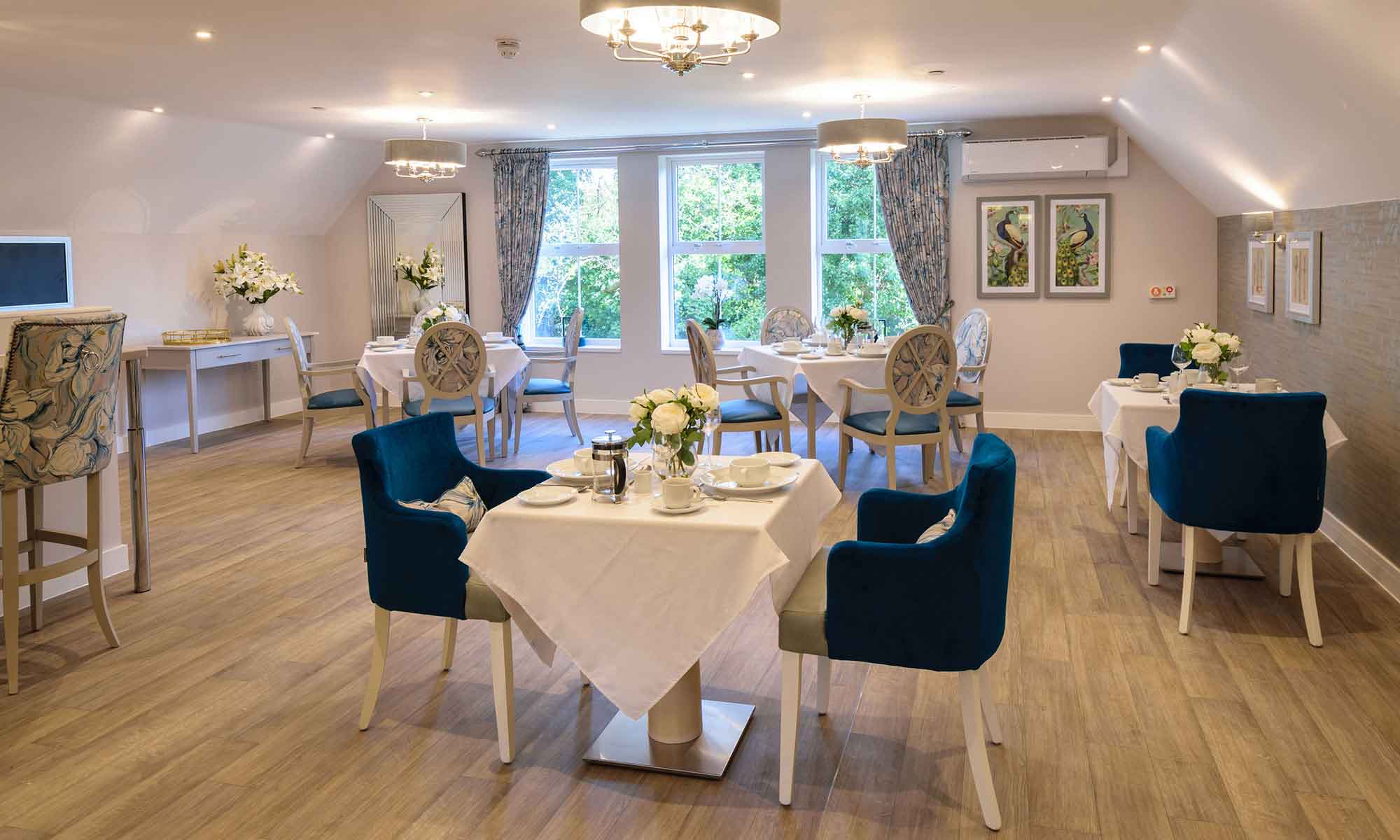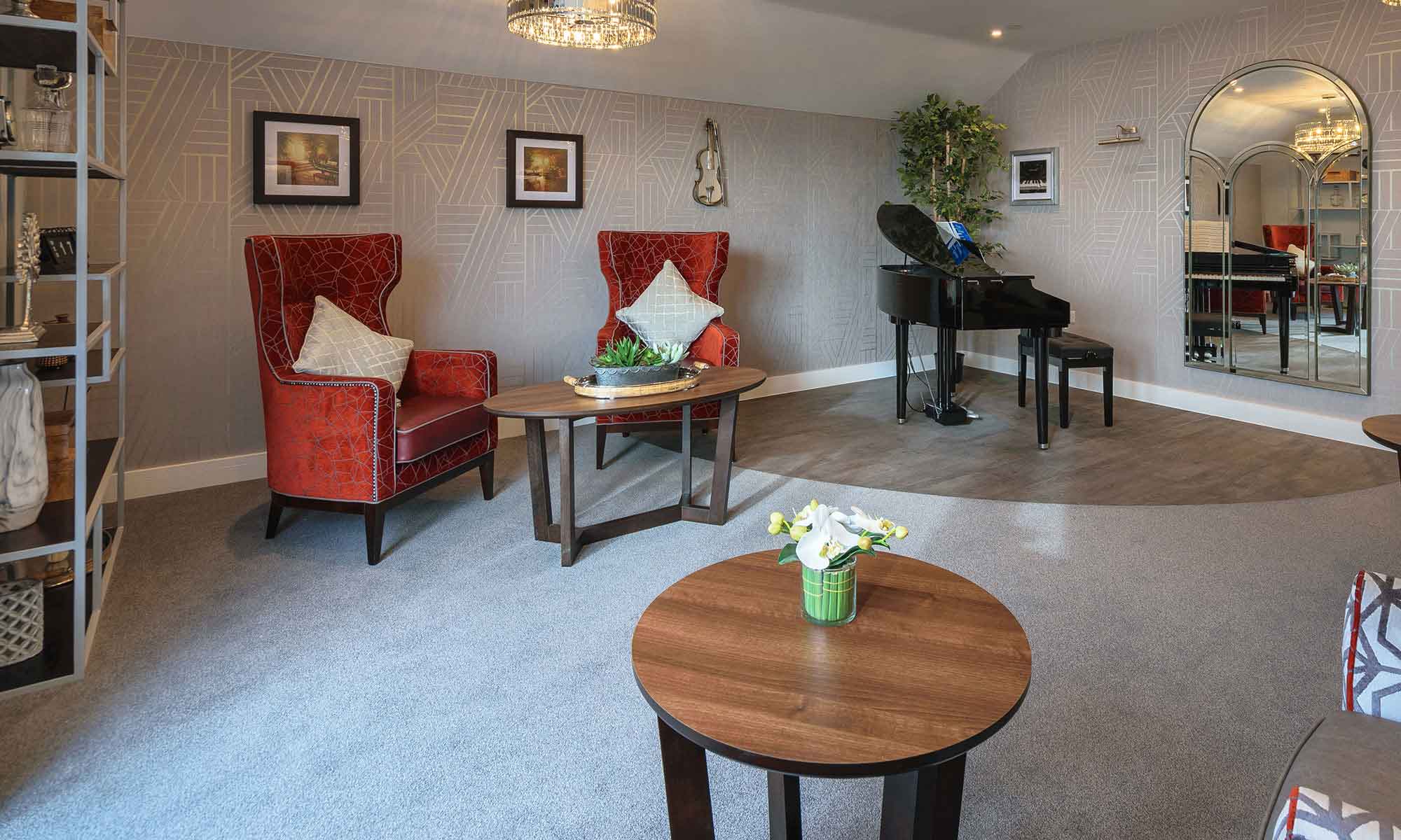 The home is over four floors with 61 bedrooms including; 11 top floor bedroom suites with their own kitchenettes, dining area, bedroom and en-suite and 50 standard en-suite bedrooms with four different colour schemes to give residents and families a choice in décor. There are three lounges and dining rooms, a music room with terrace, a garden lounge with terrace, and multiple corridors with themed seating areas.